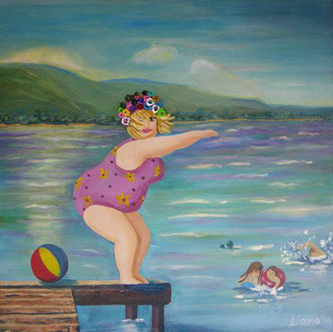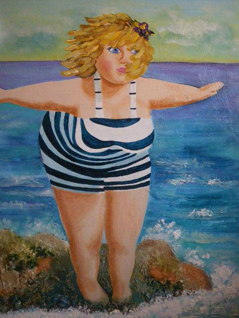 Dikke dames schilderij Geraldine - Acrylverf mixed media op katoen 70x60cm VERKOCHT