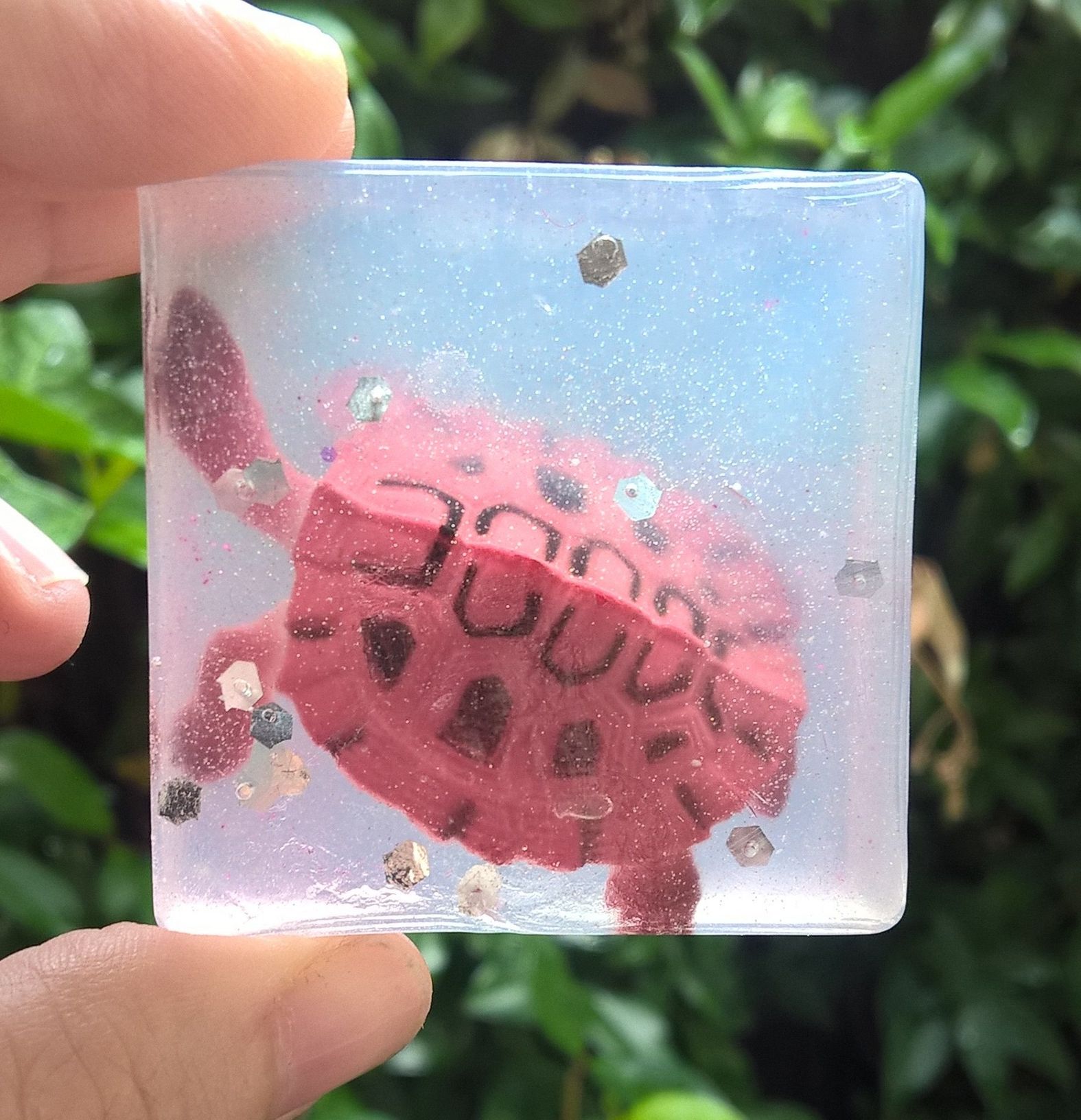 Leuk zeepje met speeltje erin en glitters.