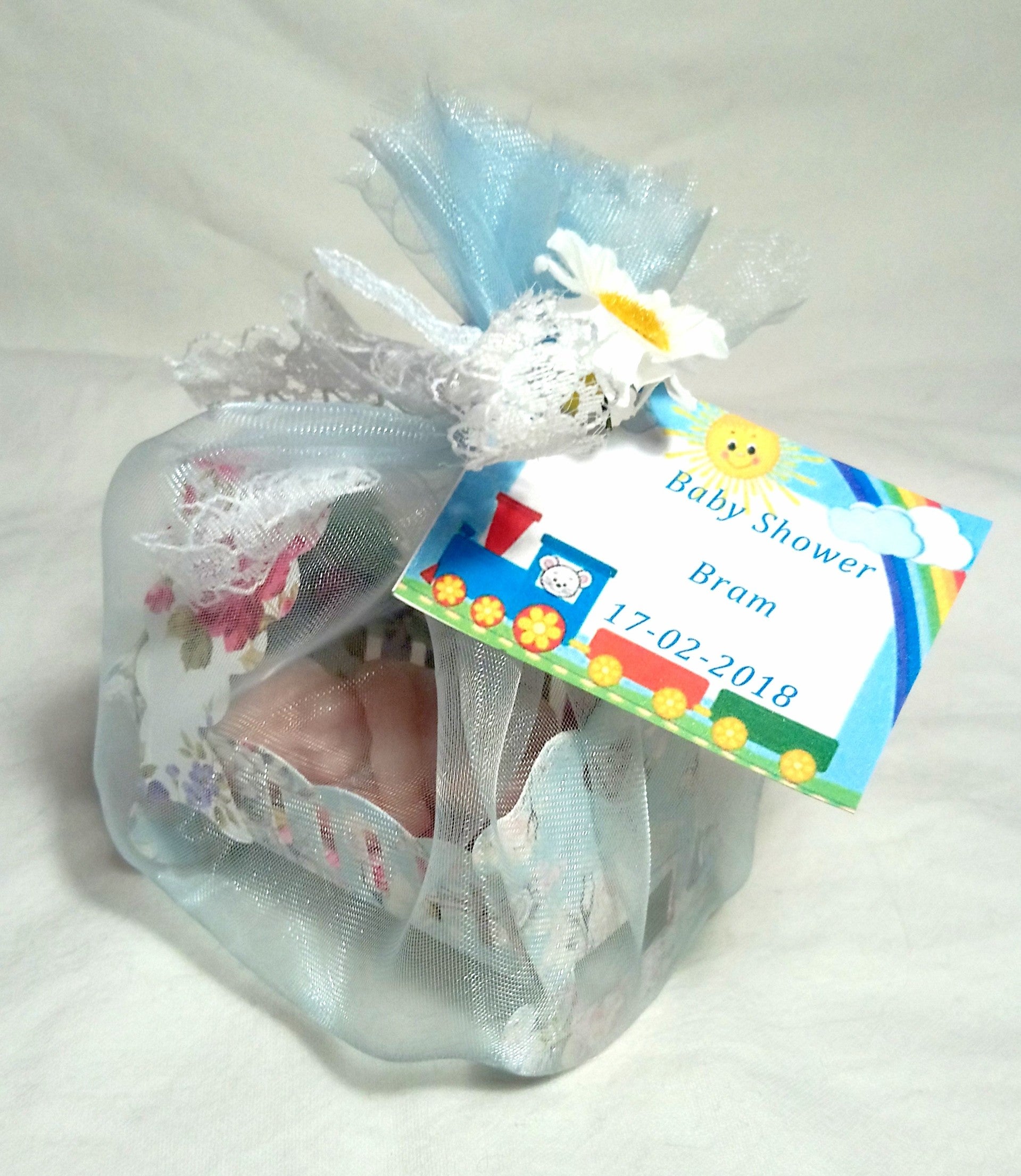Prachtig (handgemaakt!) wiegje van karton met babyzeepje. De printjes van het karton en de bloemetjes kunnen verschillen. Wordt ingepakt in tule met kaartje om zelf boodschap toe te voegen.6cm hoog en 6 cm lang.