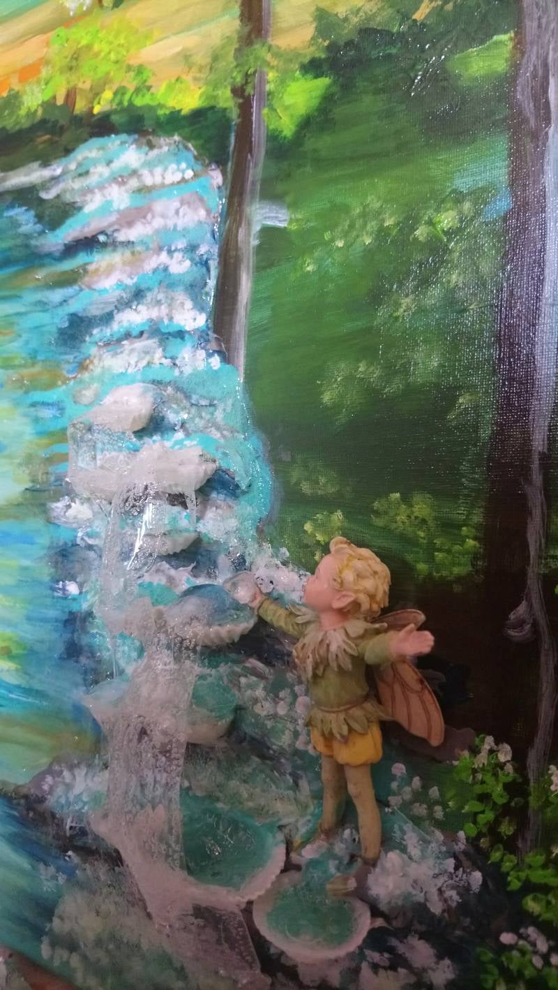 60 x 70 ingelijst, waterval is 3D, elfje houdt opaaltje