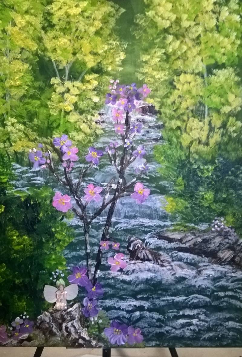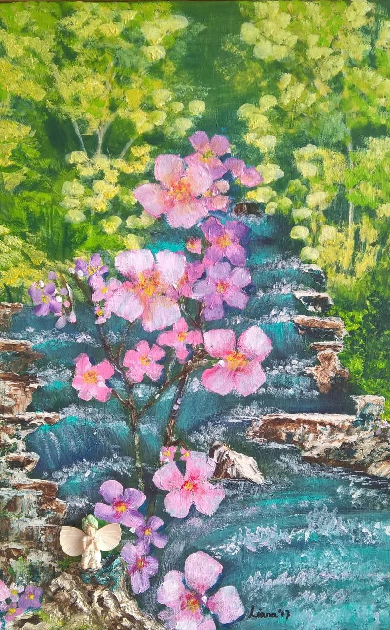 Fairywaterfall, 60 x 80 inclusief zwarte lijst, acrylverf en gemengde technieken op linnen. Elfje is 3D.