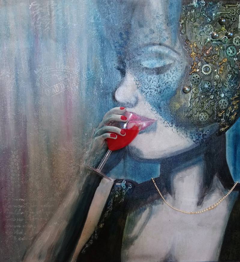 Wine lover, acrylverf en olieverf, gemengde technieken op katoen, 70 x 70 3D, wijnglas is 3D,